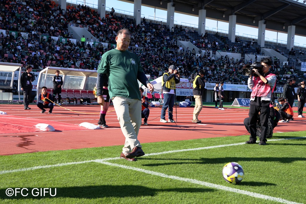 試合前には、弊社社長の松久によるキックインセレモニーも実施。ハーフタイムにはFC岐阜応援隊「SKE48」によるスタジアムライブも行われ、会場を大いに盛り上げました。