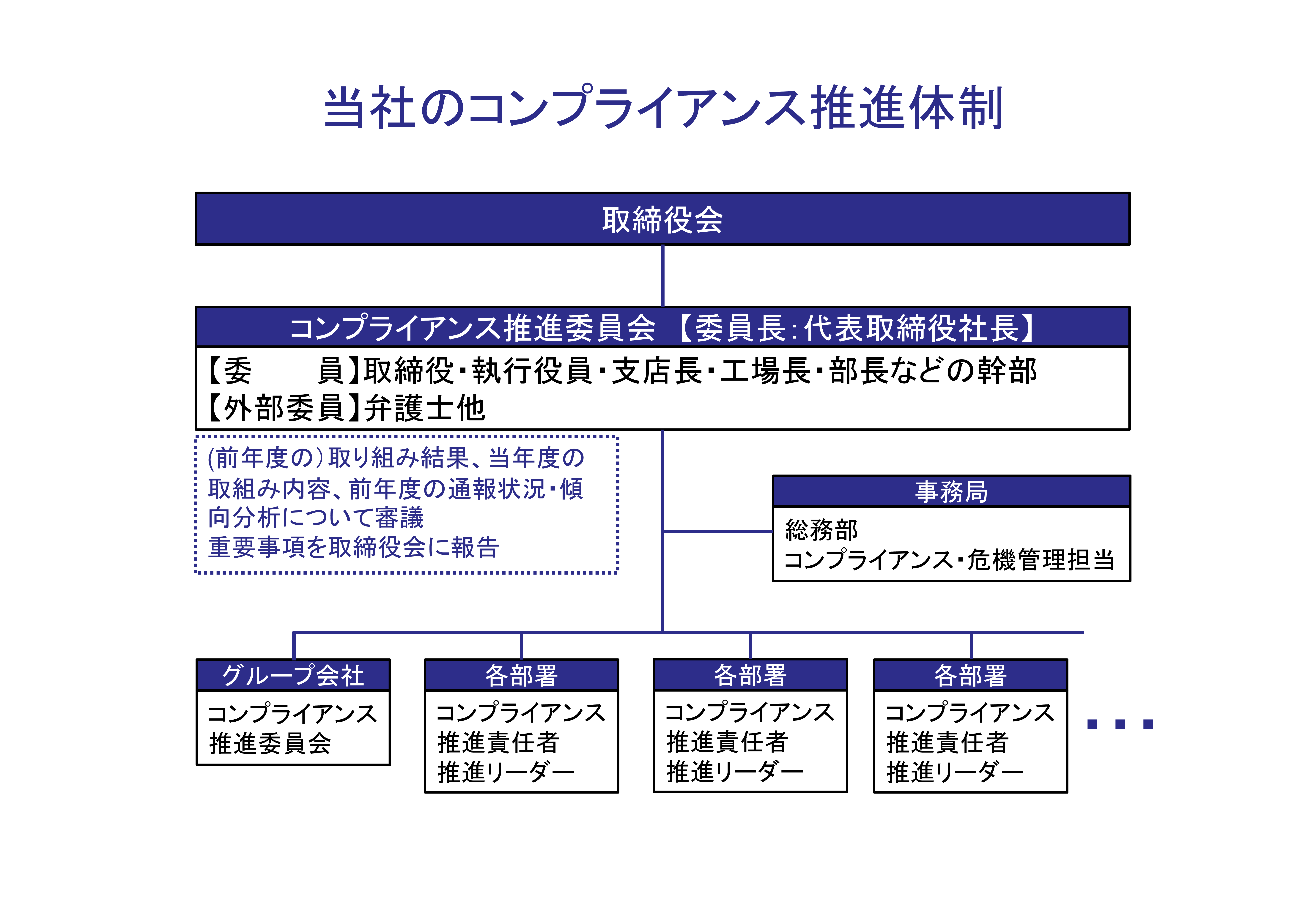 コンプライアンス推進委員会は、社長を委員長とし、委員は取締役、執行役員、支店長、部長などの幹部で構成されています。
