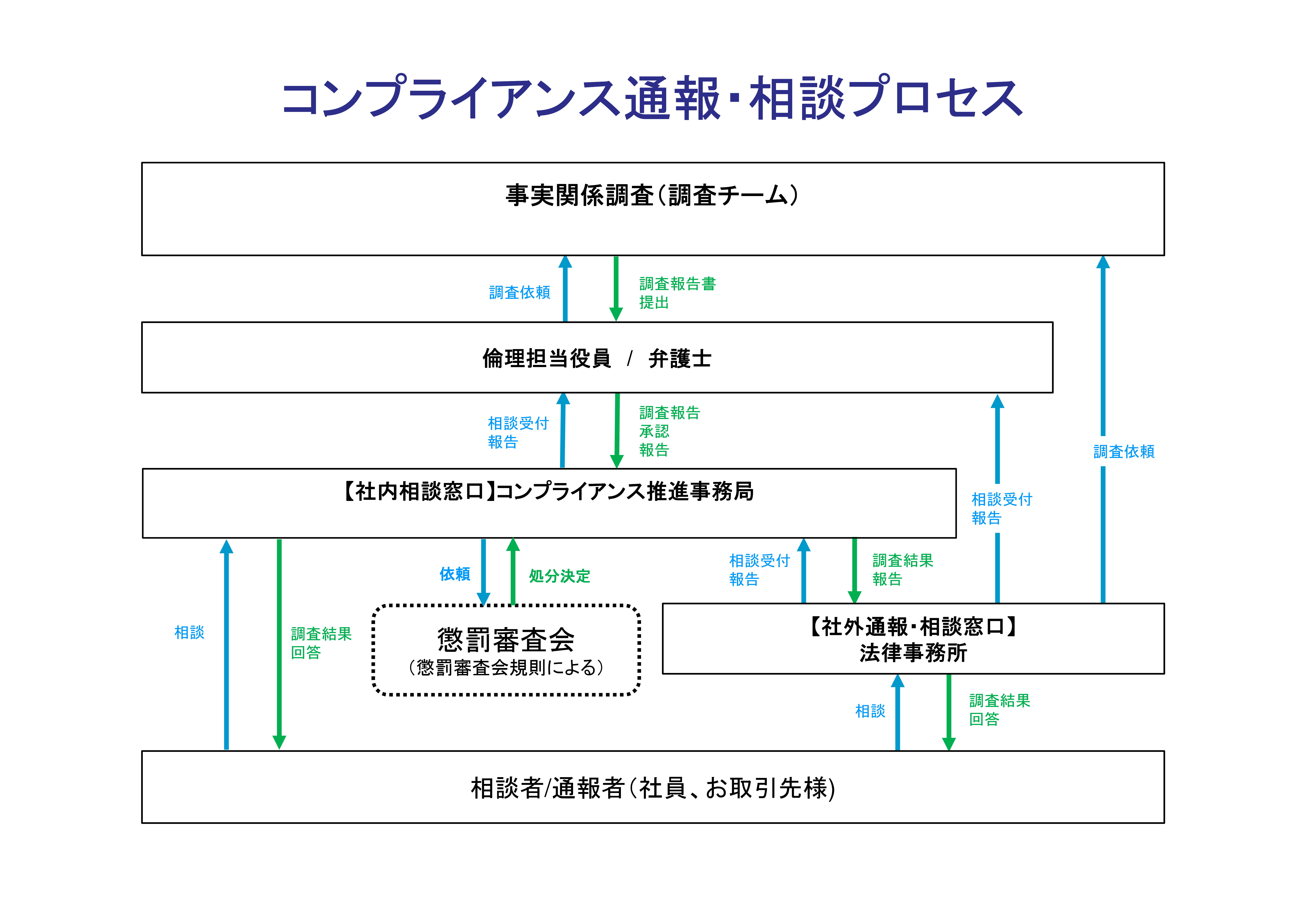 コンプライアンスに関するリスクの未然防止や早期発見をはかるために、社員とお取引先様の方を対象として「相談窓口」を社内外に設けております。社外相談窓口は、相談者の匿名性を担保する目的で社外の弁護士事務所に設置しています。相談受付にあたっては、相談者のプライバシー(匿名性)を保護するとともに、各窓口に相談したことを理由に不利益な扱いを一切しないことをルールとして定めています。