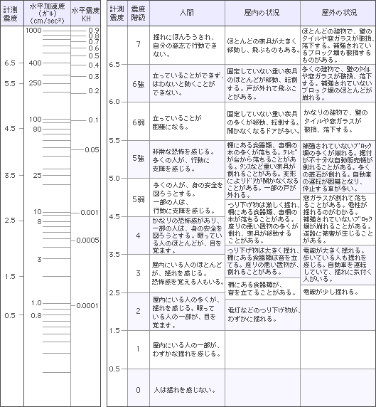 ●地震の加速度・水平震度及び震度階級関連解説表●