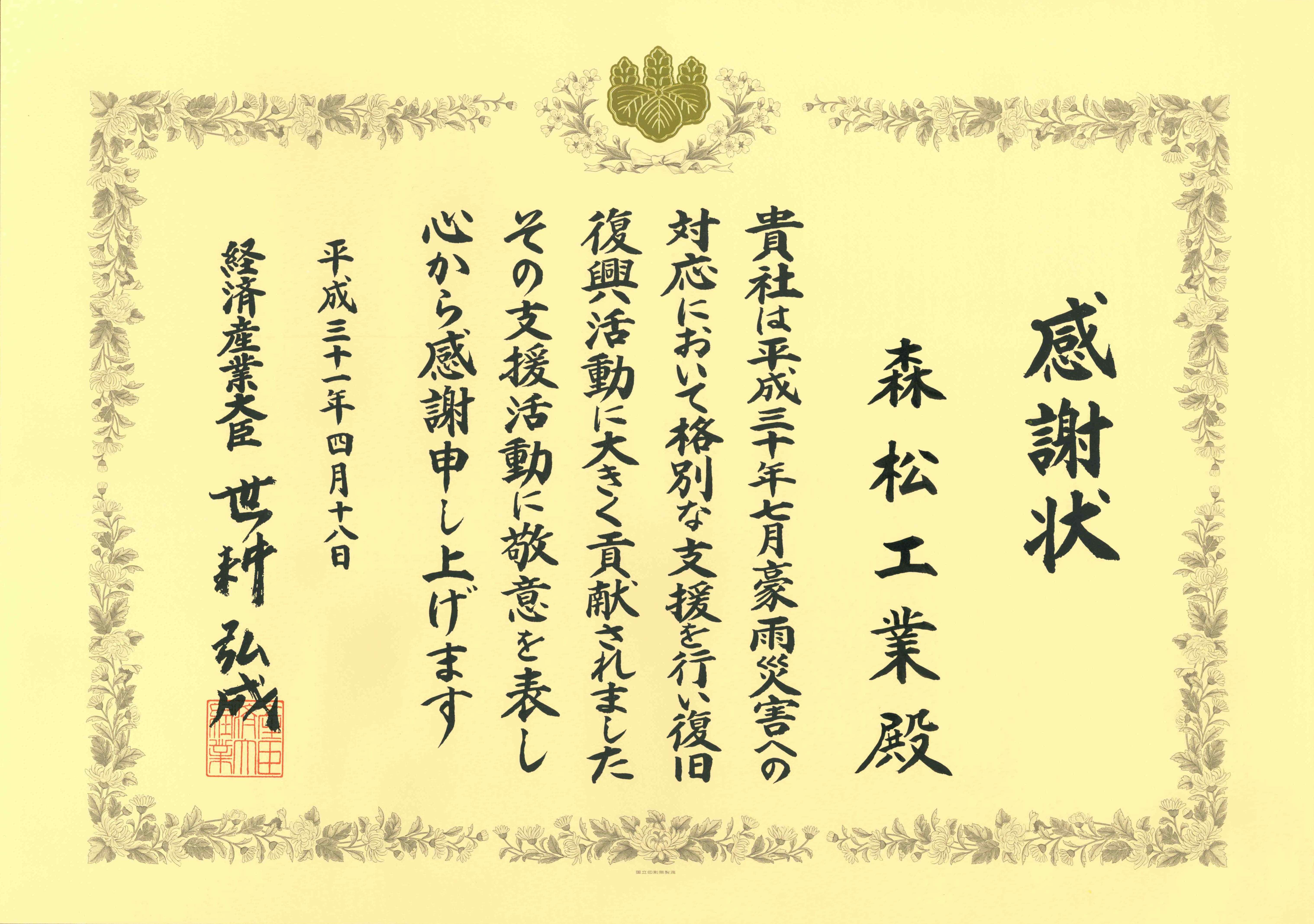 経済産業省より感謝状をいただきました(西日本豪雨災害支援)
