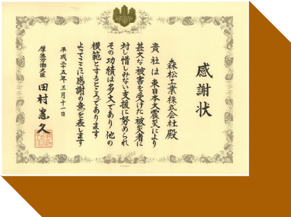 地震などの災害時には、水道・電気・ガスなどのライフラインに大きな被害が想定されます。そうした万一の災害発生時、特に「飲料水」の確保は、地域住民の皆様にとって最も重要な課題といえるでしょう。 MORIMATSUの「飲料水兼用耐震性貯水槽」は、平常時は水道管の一部として機能し、地震災害などの非常時には、消火・飲料水用の水を確保するために機能するという「1台2役」の製品です。また、住民認知度が高い地上式かつ、清潔なオールステンレス全溶接構造として初めて一般財団法人日本消防設備安全センターの認定を取得いたしました。